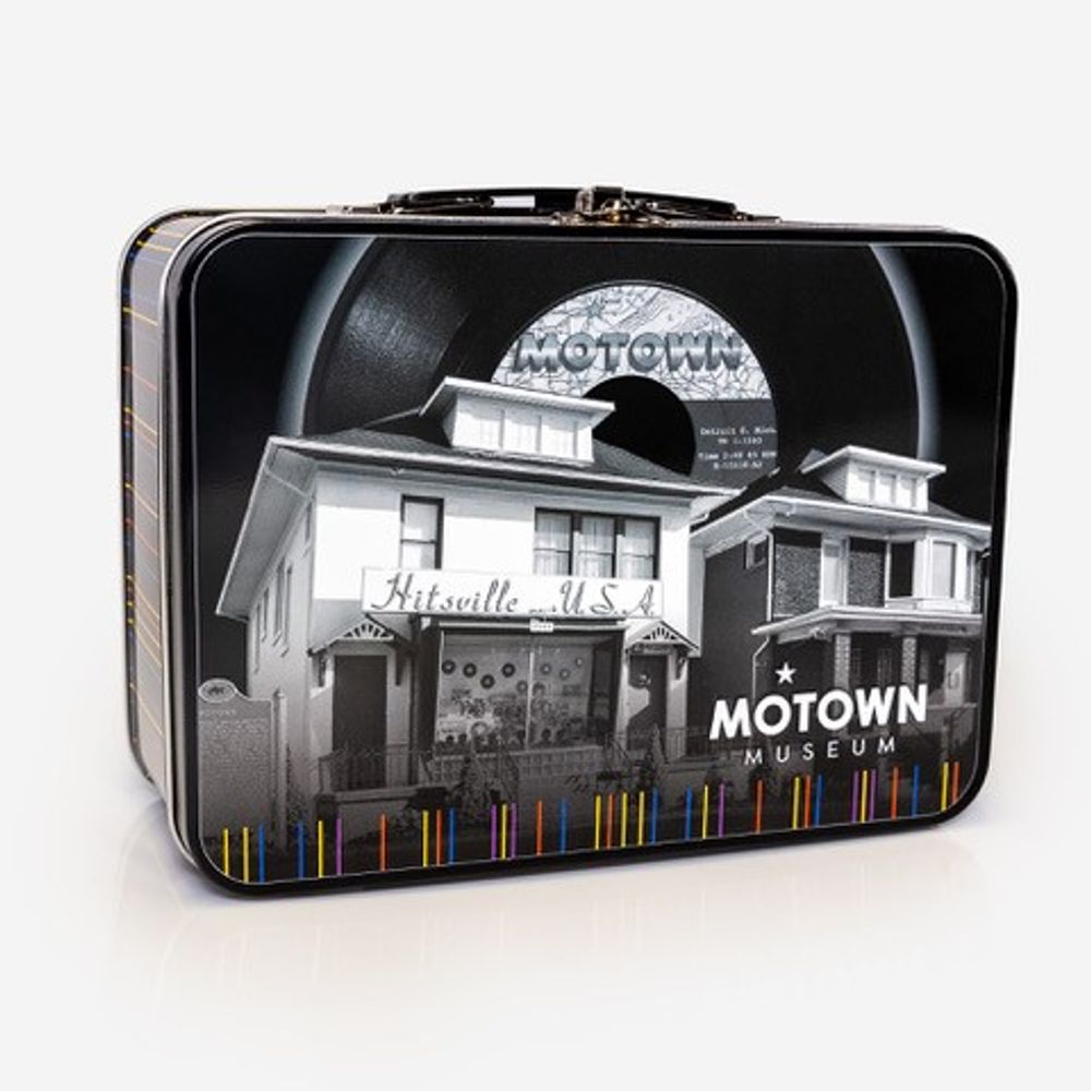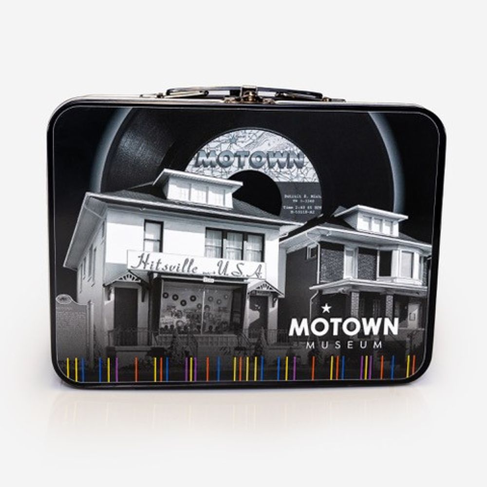 This retro metal lunch box features the historic Hitsville U.S.A. house and a classic Motown 45 record album. This lunch box measures 8”W x 6”H x 6”D.
